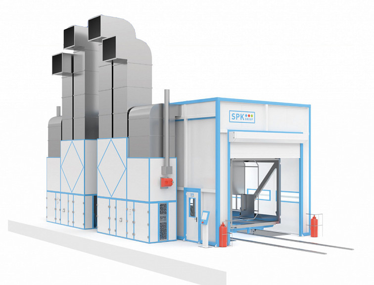 Окрасочно-сушильная камера тупикового типа SPK-SCB-12.5.5 (далее — ОСК) предназначена для подготовки изделий к покраске, нанесения на них лакокрасочных покрытий и их сушки при повышенной температуре. В камере обеспечивается равномерный поток очищенного, подогретого воздуха. Направление потока воздуха — сверху вниз камеры. Камера имеет сухой способ фильтрации воздуха от остатков краски. Это обеспечивает наилучшее нанесение лакокрасочного материала на подготовленное изделие и не требует реализации дополнительных очистных сооружений.